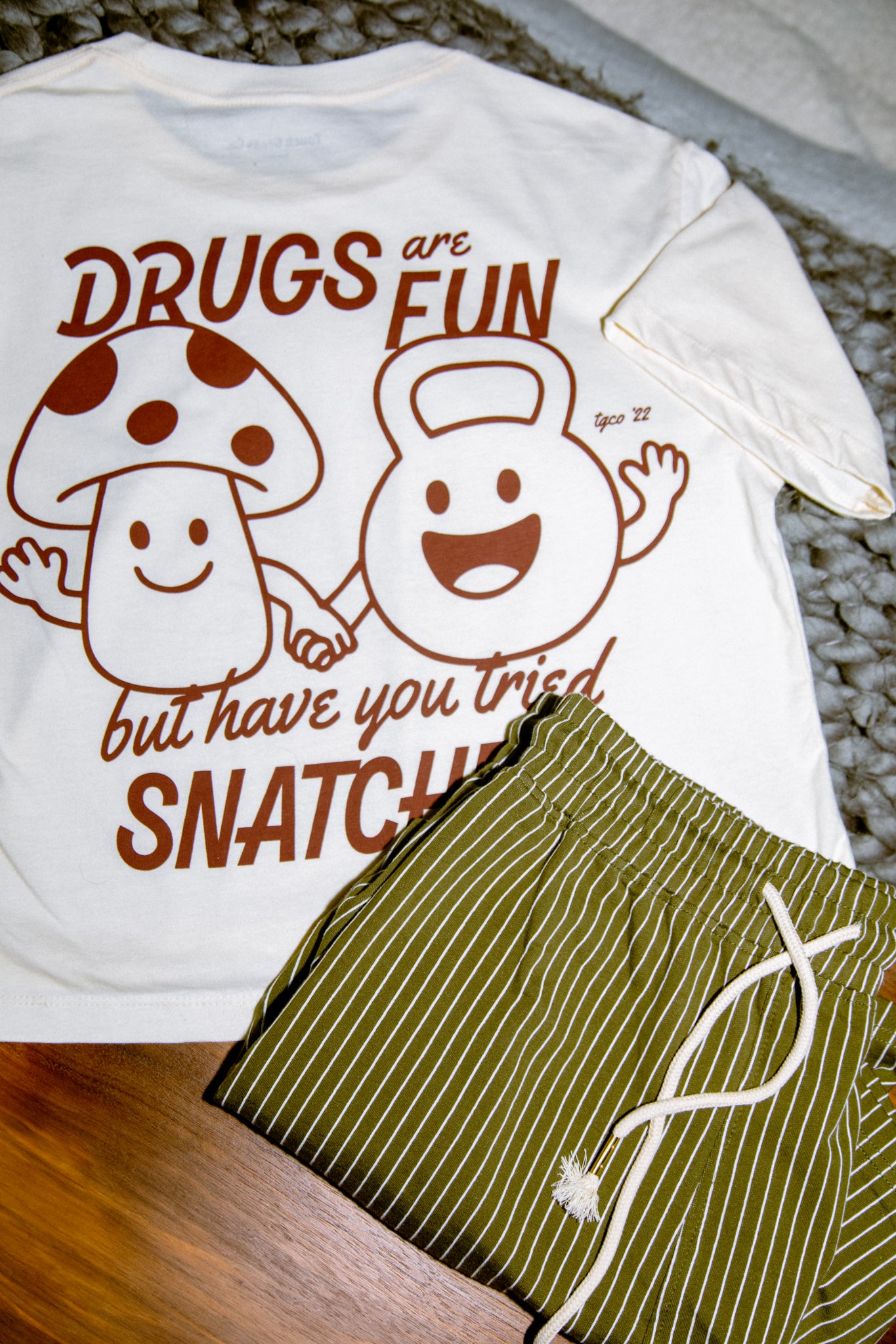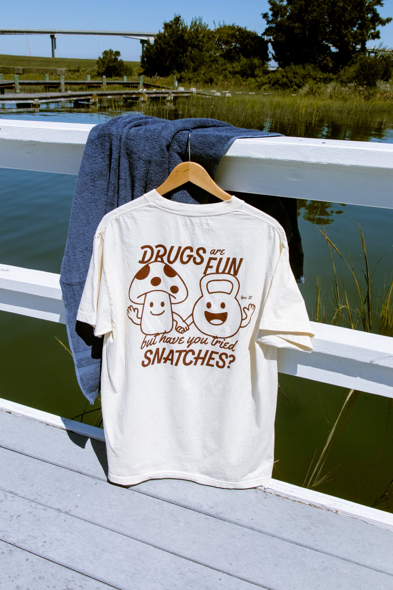 Drugs are fun, but have you tried snatches? This unapologetically cheeky tee is made for those who don’t mind a few raised eyebrows or full-on conversations with curious strangers. Wear it in public and expect to explain yourself (likely often).