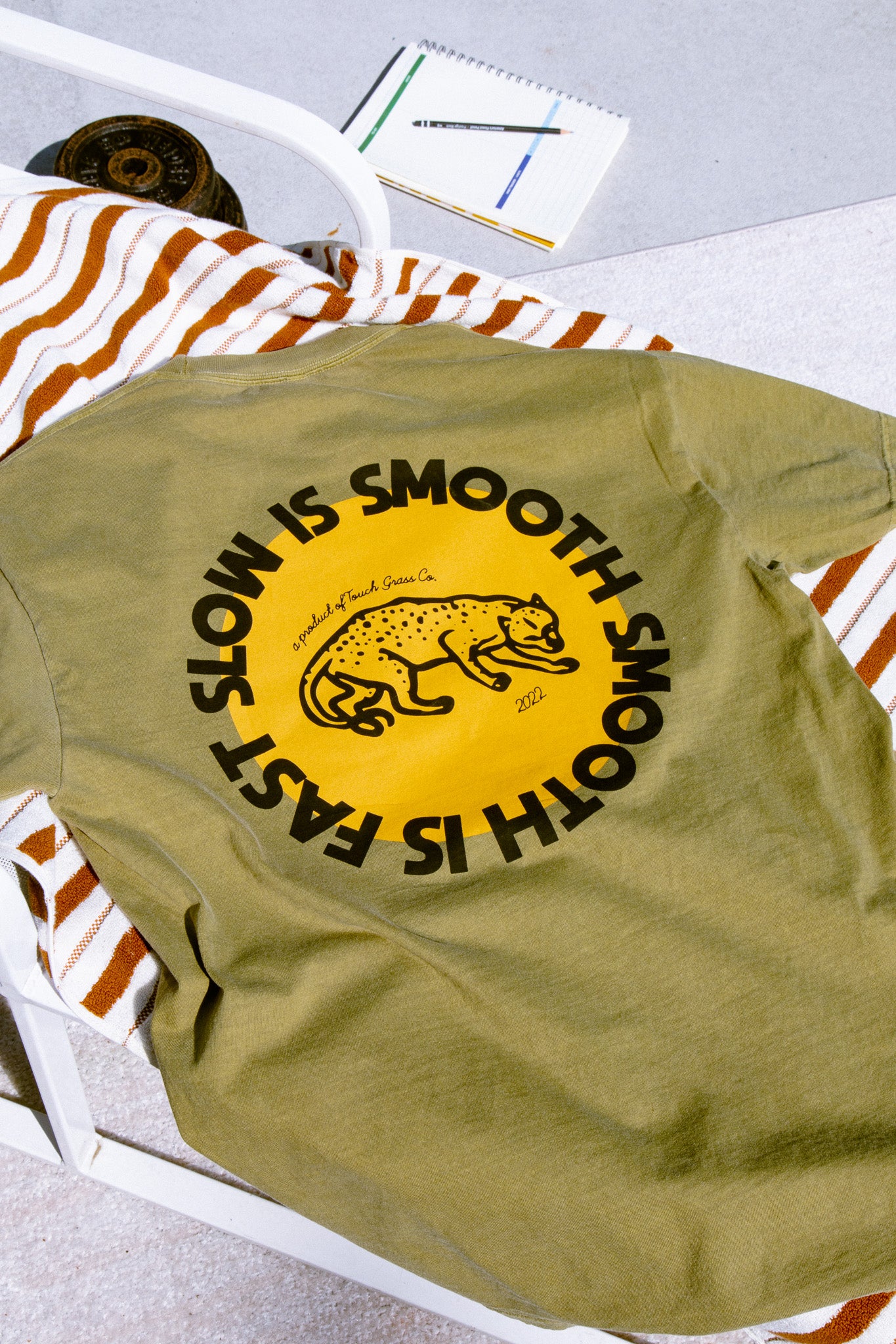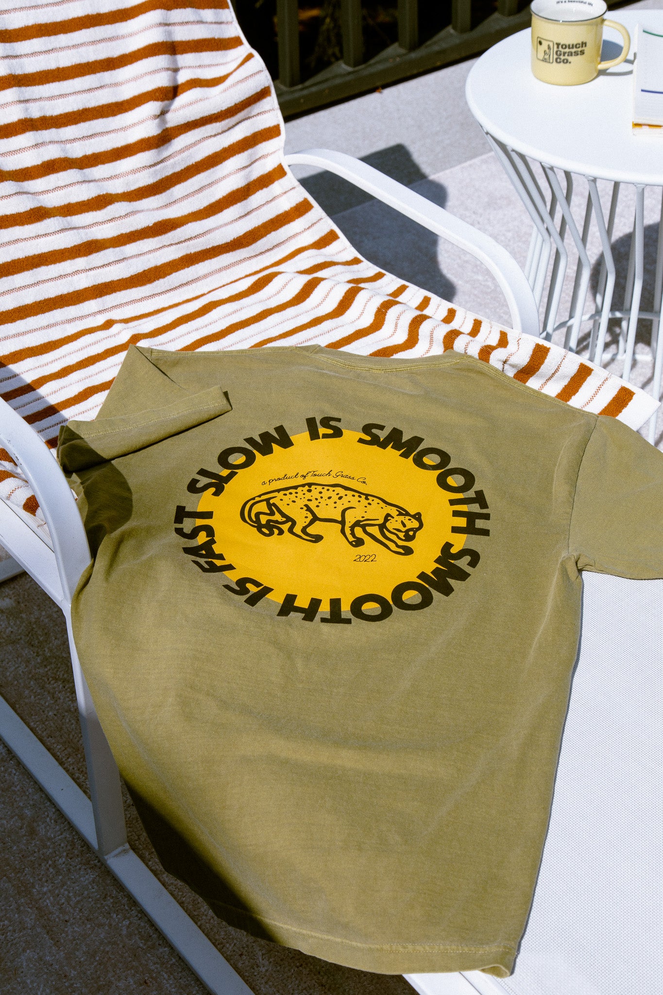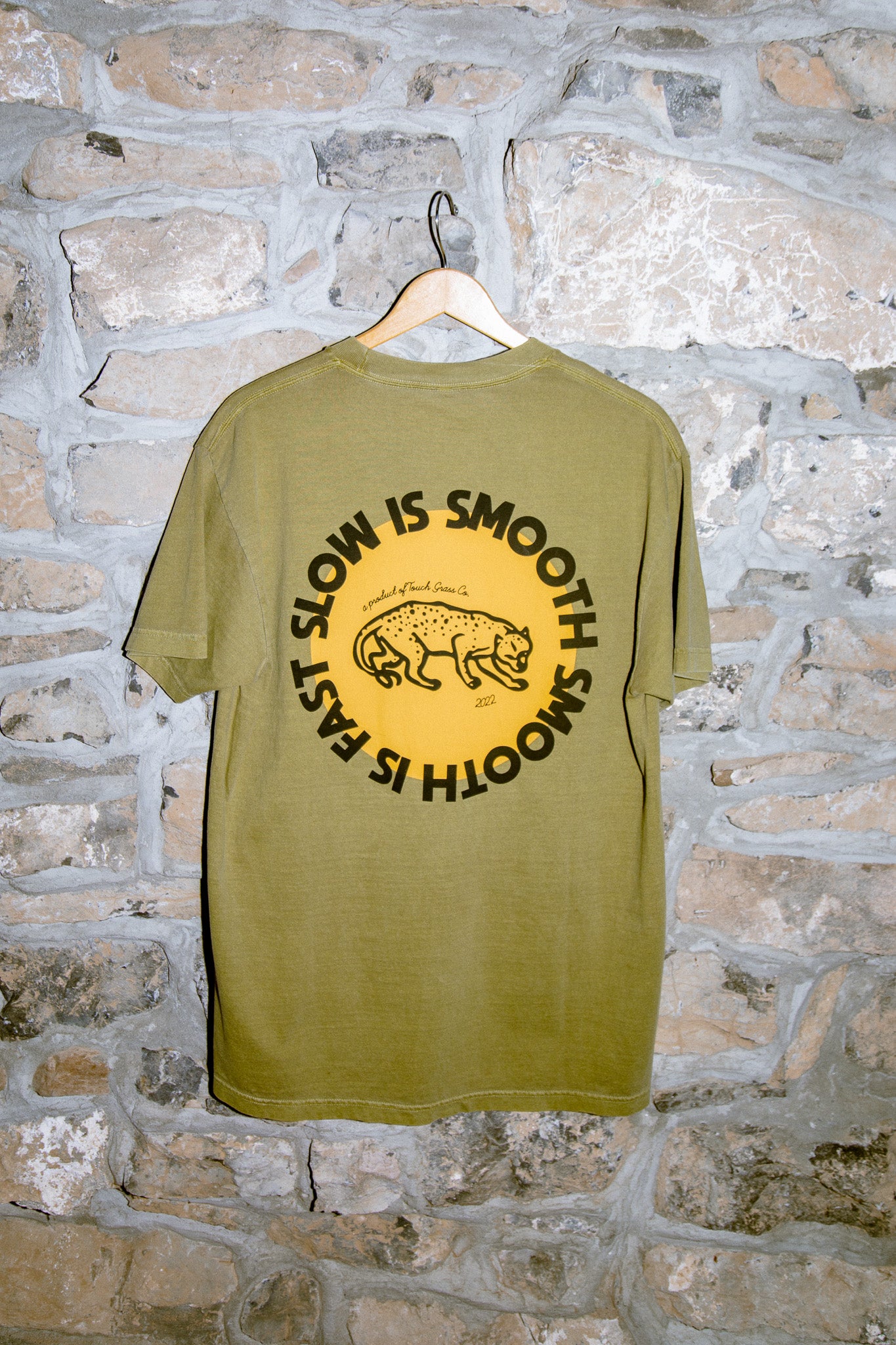 The Slow is Smooth, Smooth is Fast design is offered on an olive green tee. We remind ourselves that working mindfully and intentionally will get us to our destination quicker than working fast and heedlessly.
