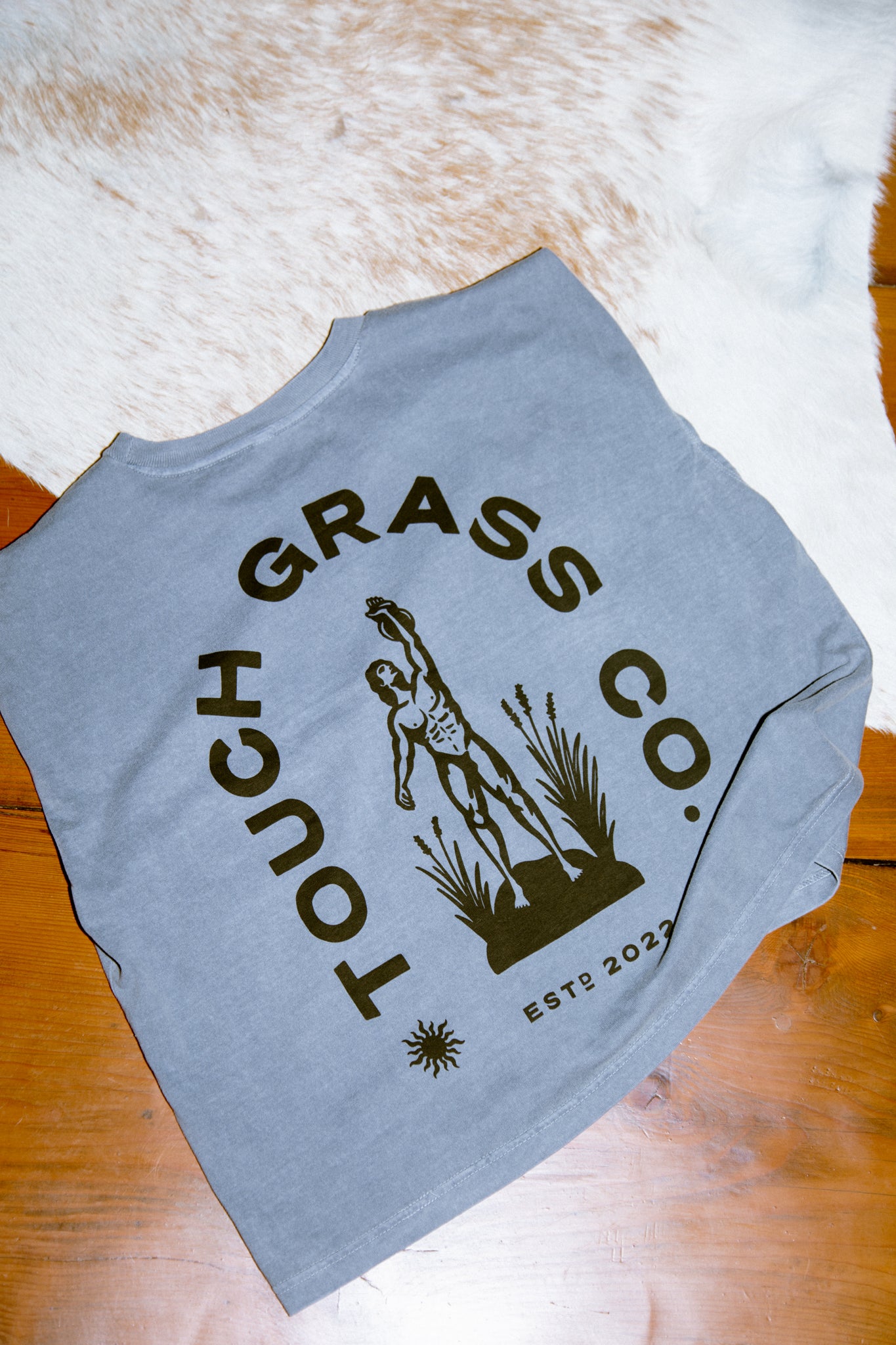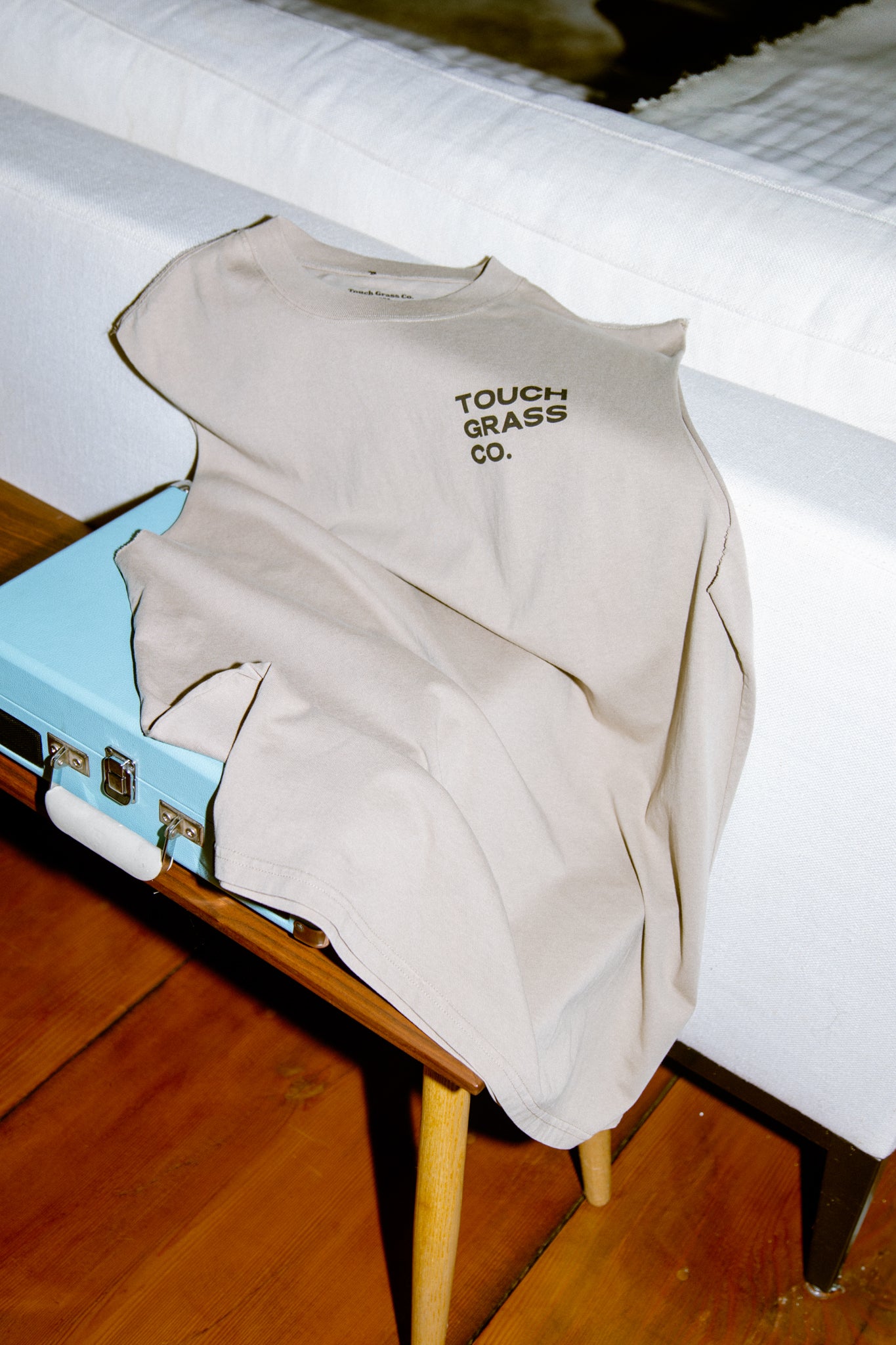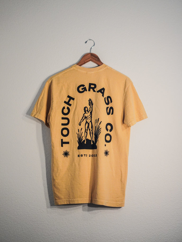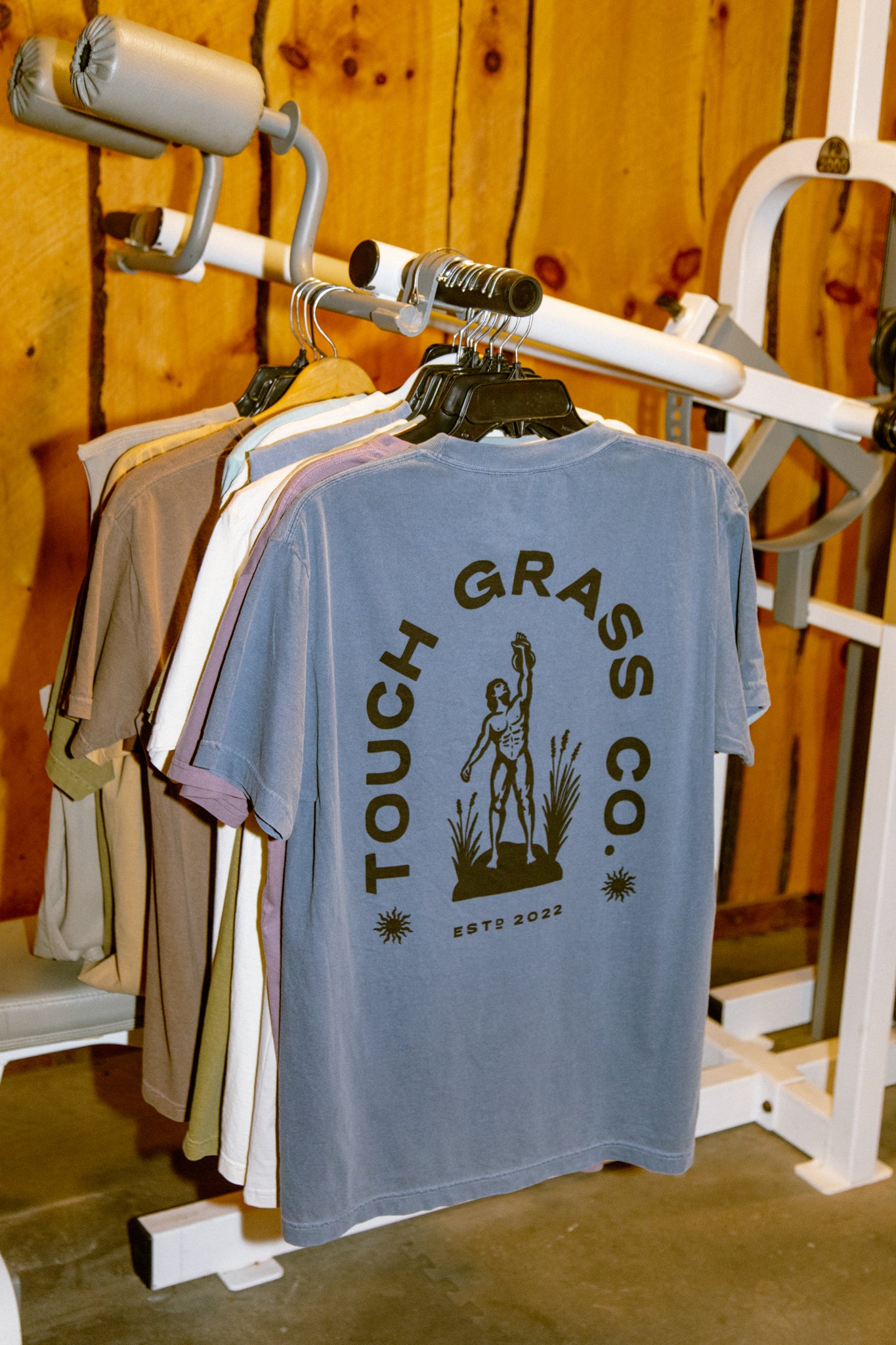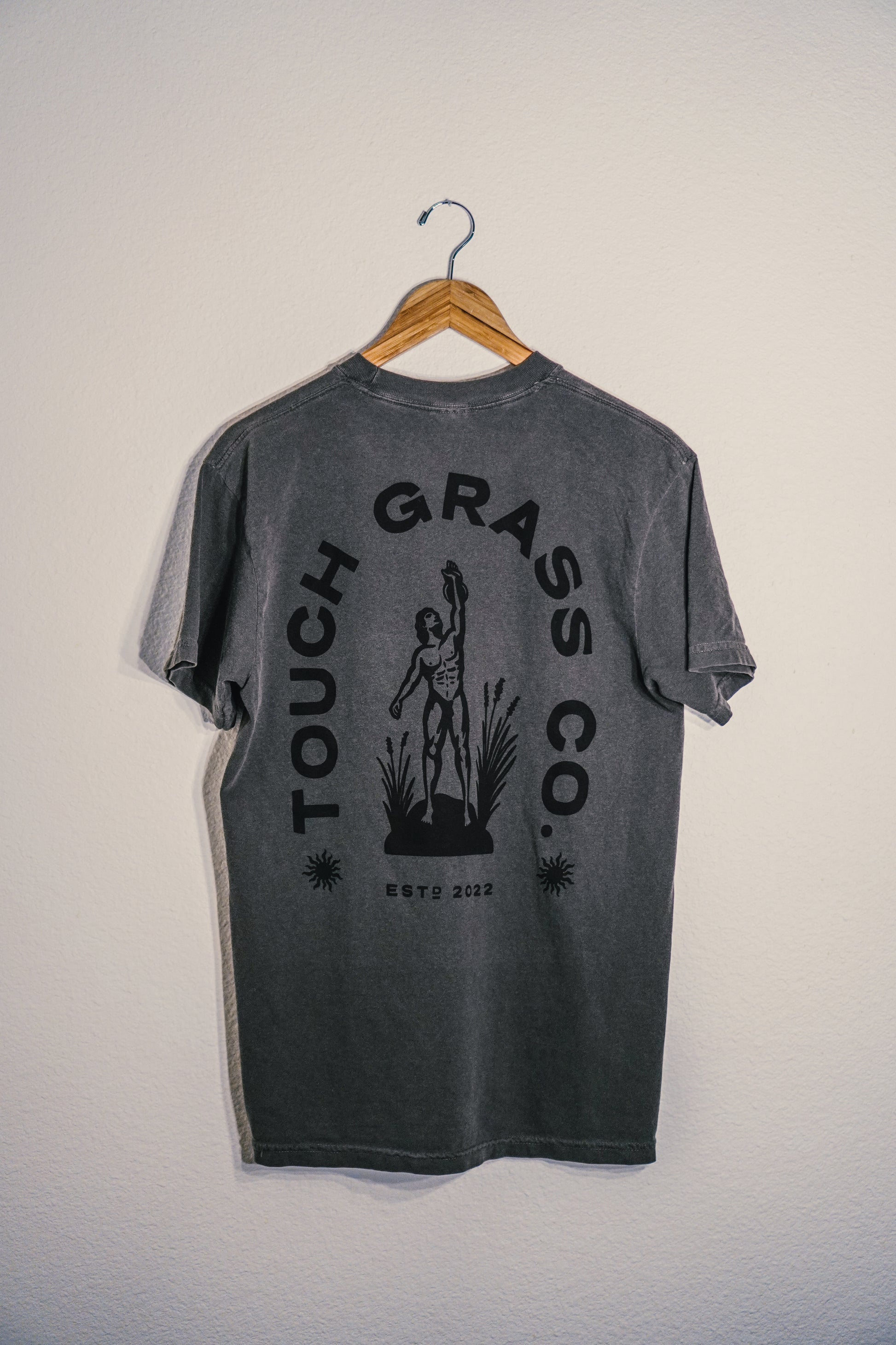Our OG tee. It features black designs on both the front and back. The back showcases an iteration of the Touch Grass Co. logo, depicting a nude figure practicing kettlebell exercises in nature.