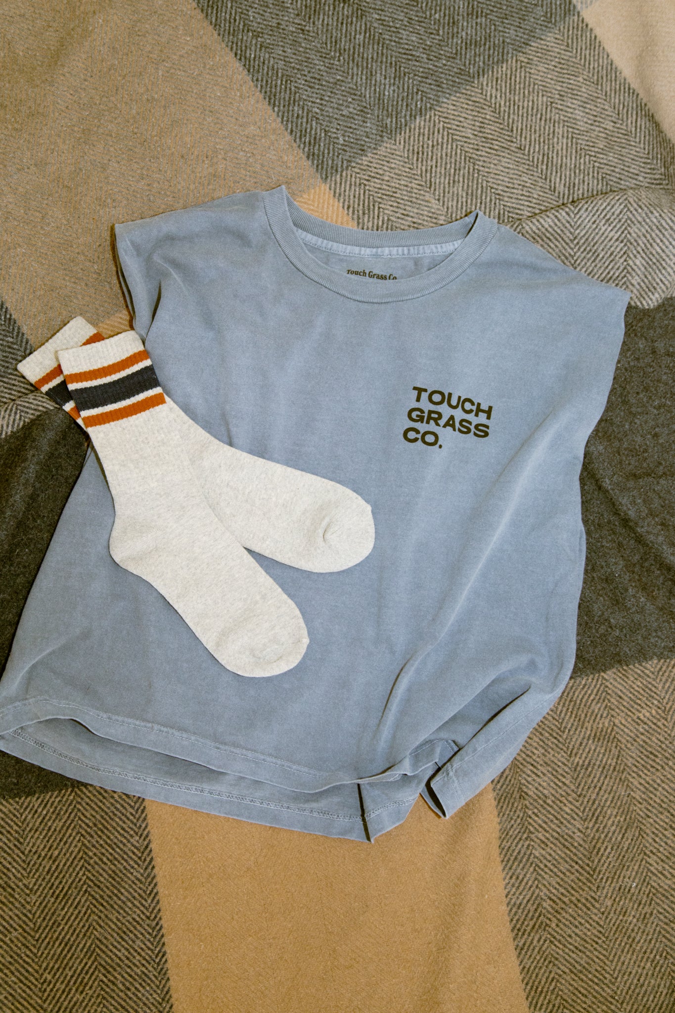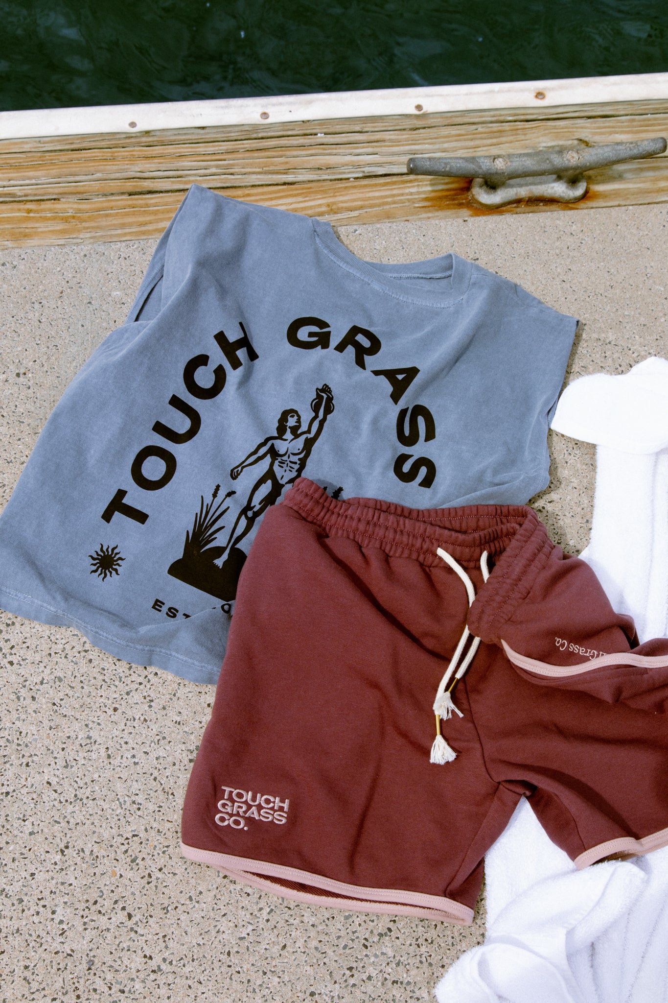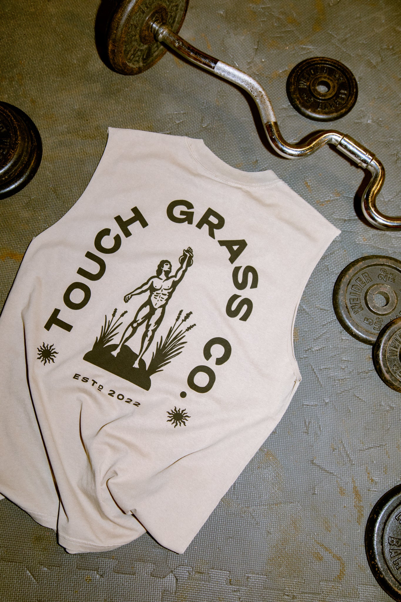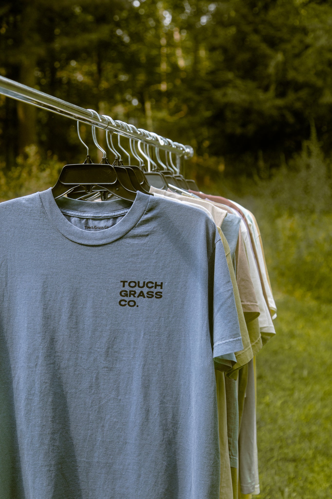 Our OG tee. It features black designs on both the front and back. The back showcases an iteration of the Touch Grass Co. logo, depicting a nude figure practicing kettlebell exercises in nature.