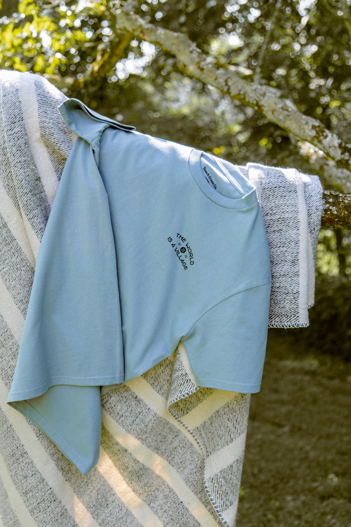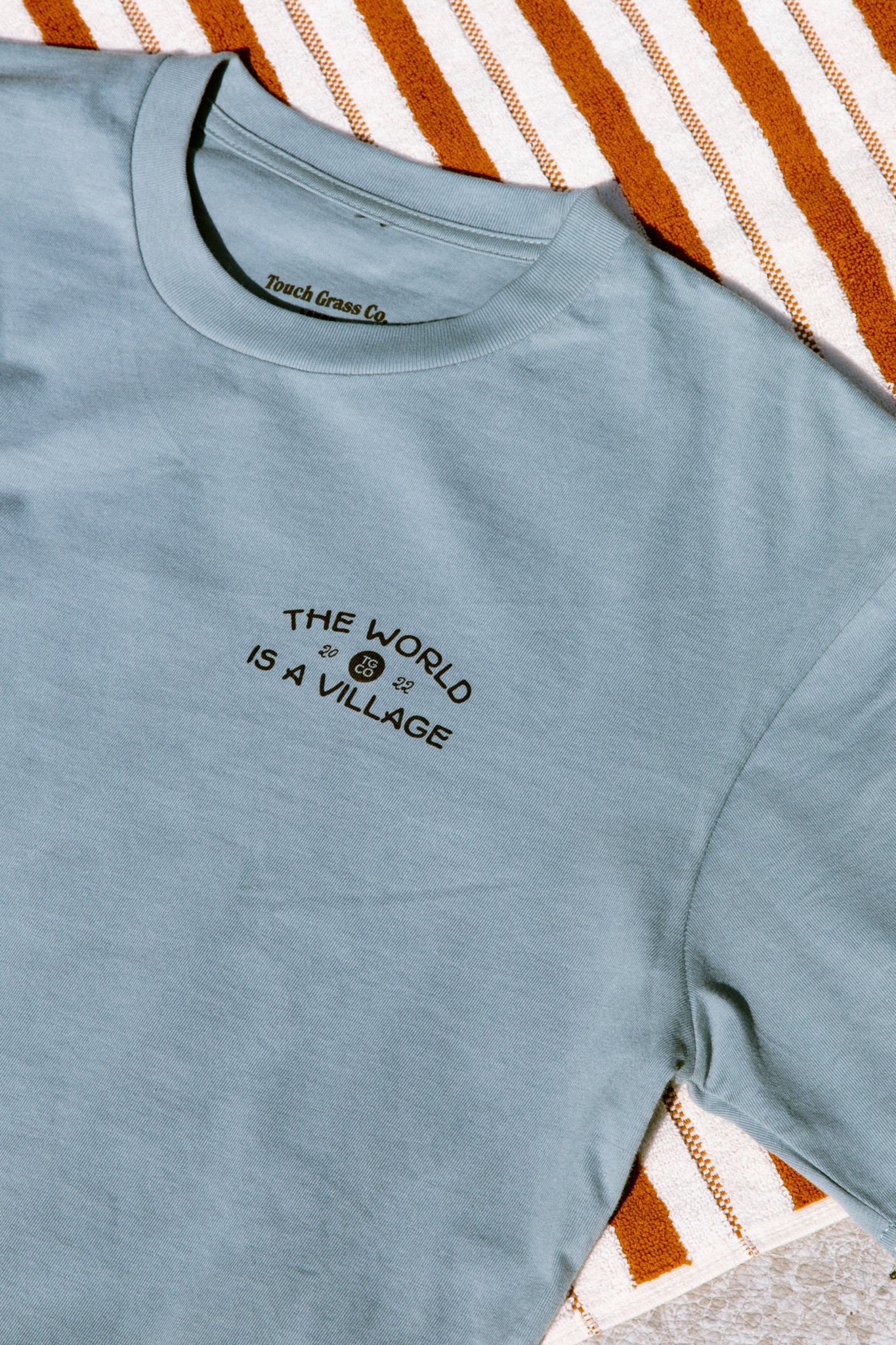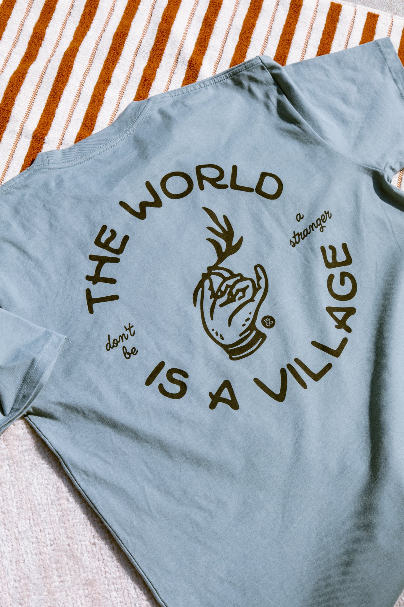 The World is a Village comes in a muted sky color. The back design features the phrase "The world is a village, don't be a stranger." We remind ourselves that even though we live in a large world, a new friend is one conversation away. Don't be a stranger.