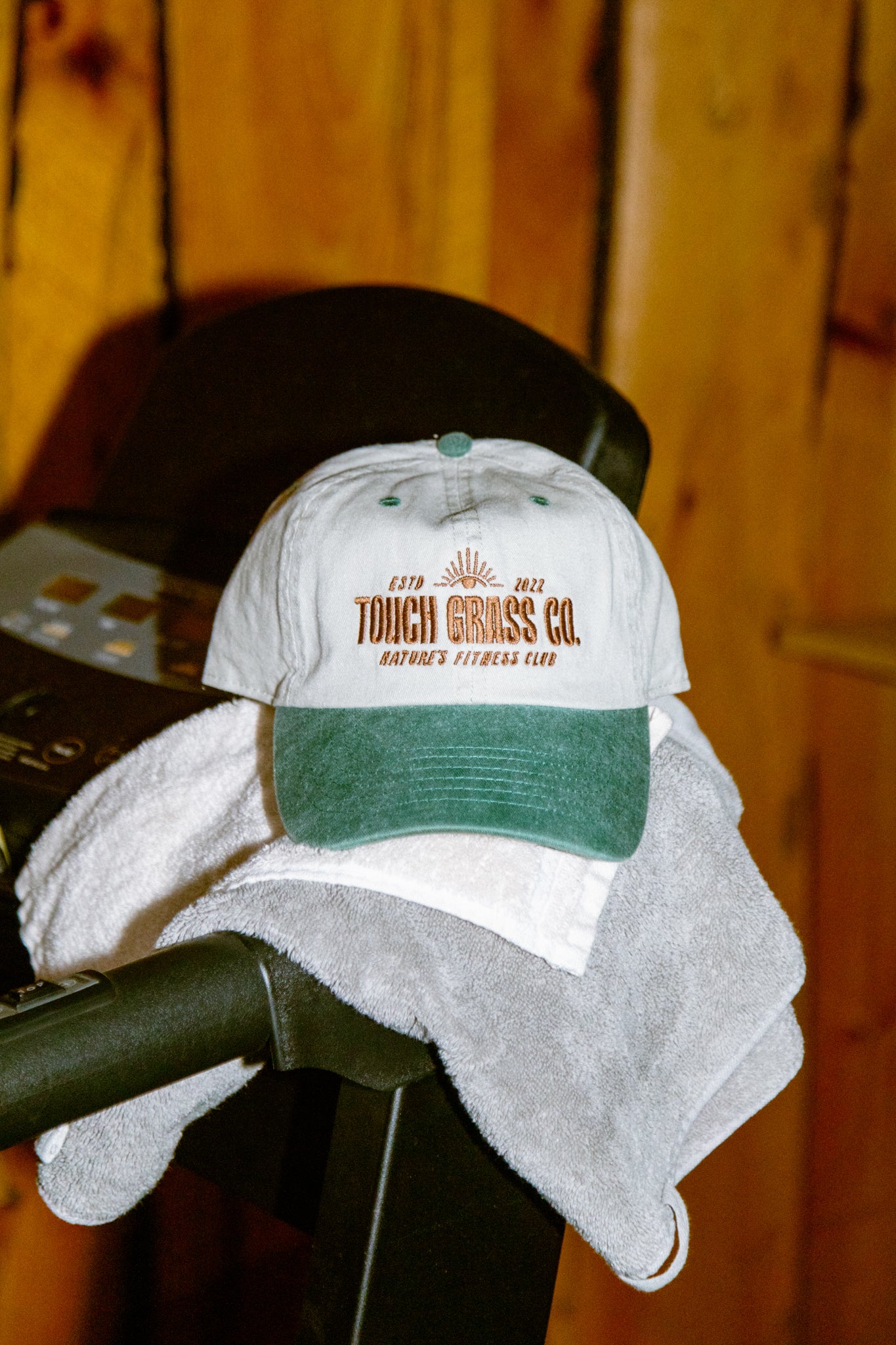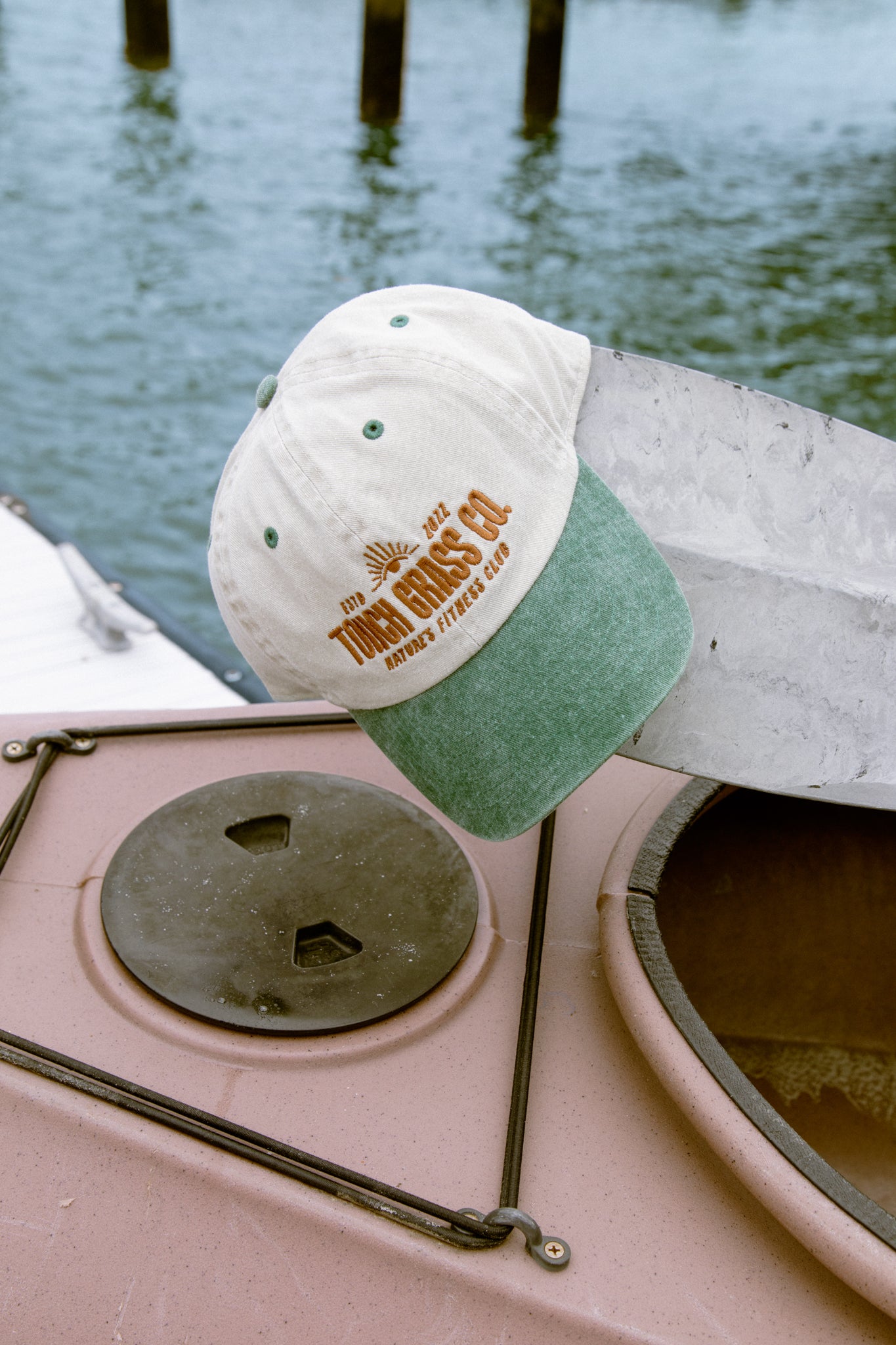Two-tone vintage hat to keep the sun out of your eyes while you swing some kettlebells and touch some grass.